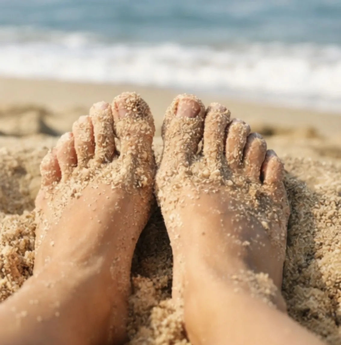 Pieds nus au bord de mer, légèrement couverts de sable 🦶☀️👙
